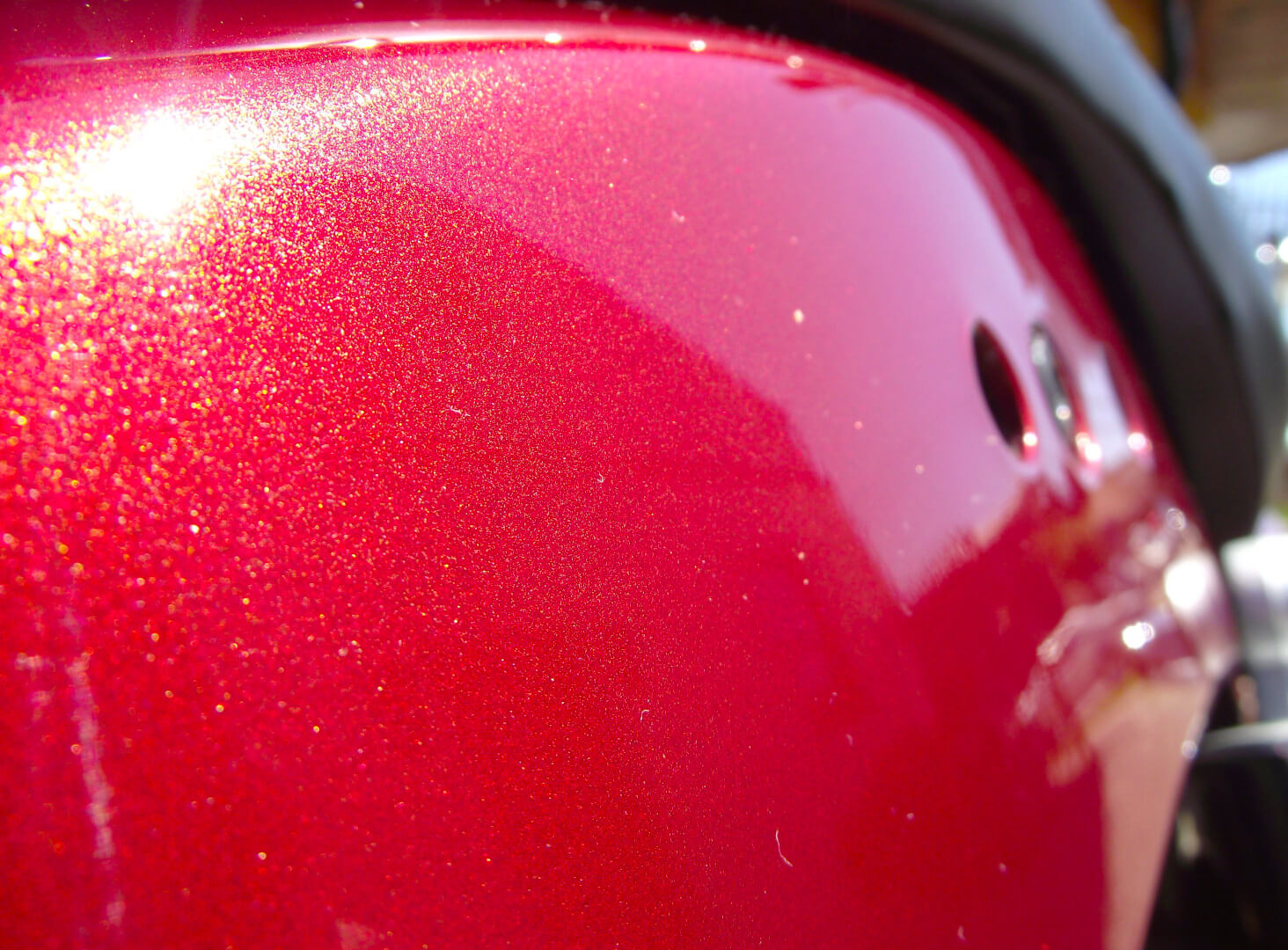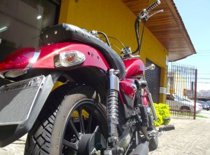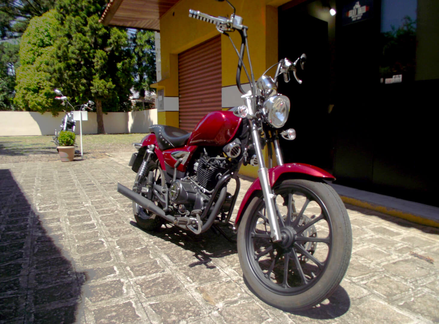 Já na “lataria” da moto, o brilho não foi poupado. Com uma tinta vermelha pigmentada com pequenos flocos brilhantes de poliuretano (não chegando a ser um flake), ela ganhou um aspecto e uma qualidade ímpar. Ah, e os cromos! Mantivemos os cromados em diversos detalhes da moto, criando aquele requinte que uma moto custom merece.