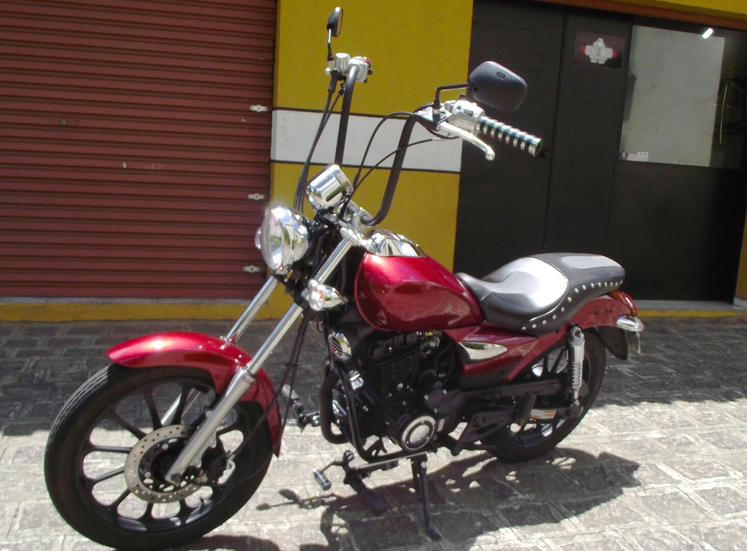 Red Pearl vista pela lateral direita, possibilitando ver seu escapamento de 6" que vai até o final do pneu traseiro, seu guidão Ape-Hanger de 14", comando avançado e sua pintura vermelho cereja brilhante.